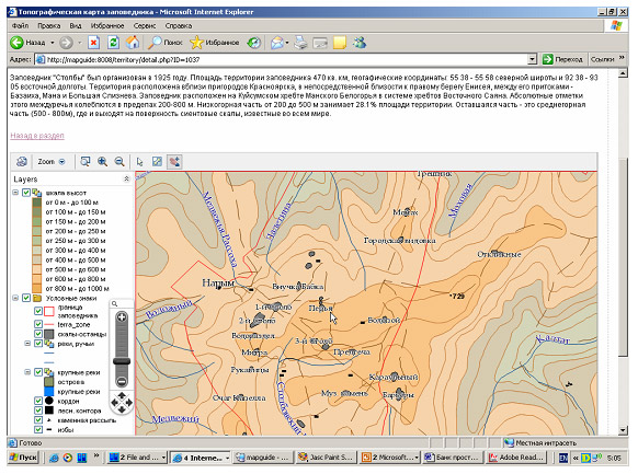 ![]() Рис. 6. Веб-интерфейс к цифровой модели территории заповедника «Столбы» на геоинформационном Интернет-портале ИВМ СО РАН Разработаны методические, алгоритмические и программные средства для формирования геоинформационного Интернет-портала и его картоориентированных информационно-аналитических сервисов, банка геопространственных данных. В основе разработки лежит комплекс интегрированных информационных и телекоммуникационных технологий, адаптированных к применению в составе распределенных информационно-аналитических Интернет-систем, предназначенных для решения задач, связанных с динамическим формированием наборов пространственных данных, построением тематических интерактивных карт и картограмм на основе топологических связи пространственной и семантической информации, обработкой данных спутникового экологического мониторинга. Специализированная ГИС-библиотека включает в себя клиентское программное обеспечение (набор скриптовых программ на языке JavaScript и шаблонов элементов пользовательского интерфейса) и серверное программное обеспечение с применением PHP. В составе геоинформационного Интернет-портала разработано многоуровневое хранилище спутниковых снимков высокого разрешения, наполненное для территории Красноярского края, с развитыми средствами доступа, расширенными интерфейсами для просмотра данных и их программной обработки. Апробация предложенных методов и технологий была проведена на ряде конкретных задач — создании комплексных цифровых моделей природных территорий (заповедники «Столбы» и «Центральносибирский»), мониторинге качества водных ресурсов на примере анализа водно-солевого режима речной сети (в заповеднике «Центральносибирский») и др. (О. Э. Якубайлик, А. А. Кадочников, А. А. Токарев, В. Г. Попов). Основные публикации (по блокам). К блоку 1: