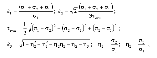 ![]() где σ1, σ2, σ3 — главные напряжения в конечном элементе в области вершины трещины, характеризующемся максимумом эквивалентных напряжений. Характерный вид зависимостей показателей k1, k2, k3 от длины трещины представлен на рис. 14. Как вытекает из построенных графиков, рассмотренные показатели существенно отличаются по реакции на рост длины трещины. Наблюдаются максимумы коэффициентов трехосности напраженно-деформированного состояния (НДС), причем для трещин различной ориентации они соответствуют различной длине. Установлено, что коэффициенты k1 и k2 являются более чувствительными к изменениям соотношения главных напряжений.